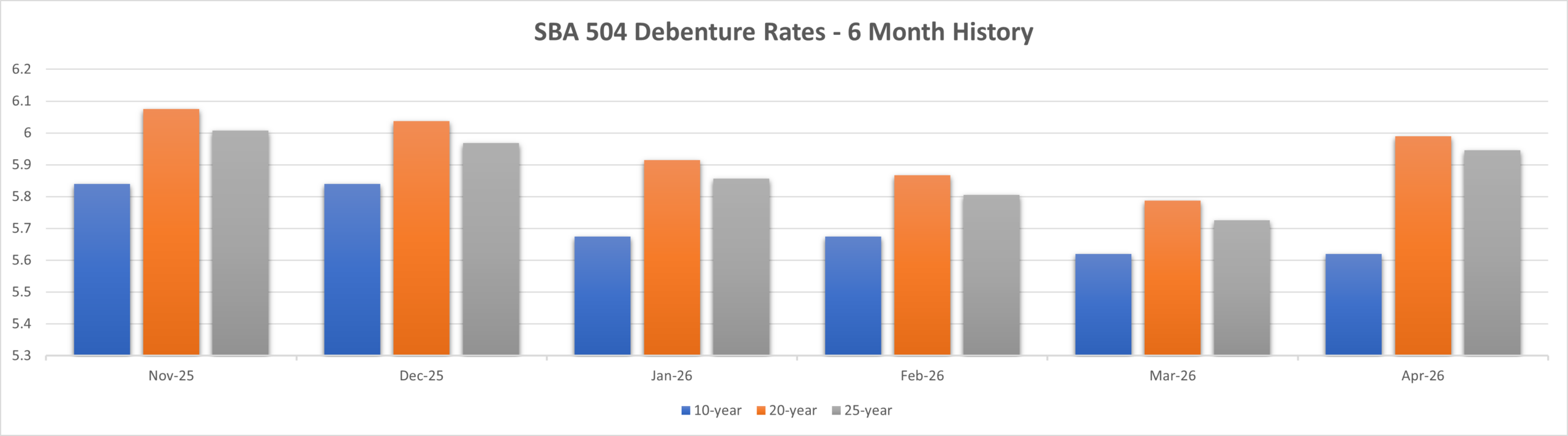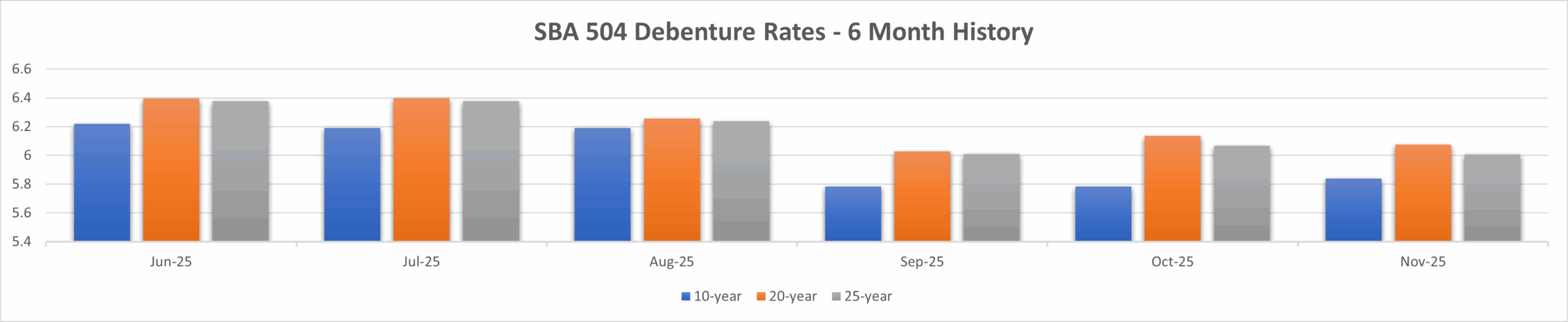 The chart below represents the approximate effective interest rate of the SBA portion of a loan by averaging the note rate plus all servicing fees, amortized over the life of the loan. NOTE: 10-year debenture sales take place every other month, thus 10-year rates are also published every other month.